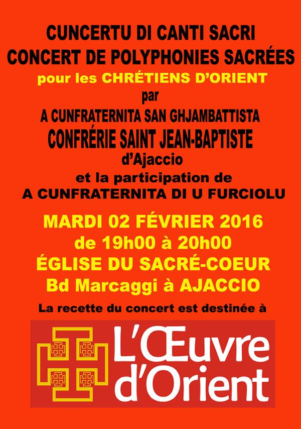 La Confrérie Saint Jean-Baptiste d’Ajaccio organise, au profit de l’Œuvre d’Orient, un concert de polyphonies sacrées, mardi 2 février 2016, de 19h à 20h, en l’église du Sacré-Cœur.