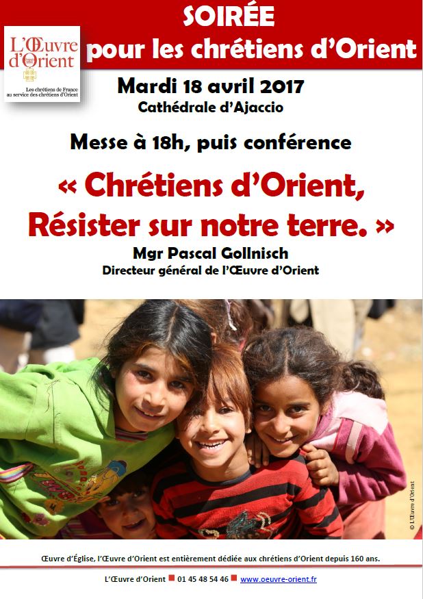 Mardi 18 avril 2017, Mgr Pascal Gollnisch, directeur de l’Œuvre d’Orient présidera la messe de 18h en la Cathédrale d’Ajaccio, puis donnera une conférence autour du thème « Chrétiens d’Orient, résister sur notre terre ».