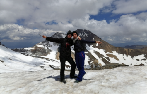 Les week-ends nous ne perdons pas le rythme adopté depuis le début : monastères, randos, restos, nuit chez l’habitant et rires ! Absolument conquise par ce pays, je ne me lasse pas de tant de beaux et variés paysages. 3 jours de week-end dans le Sud, me font tomber amoureuse du monastère de Noravank : entouré de roches orangées, j’en reste ébahie quelques temps avant de poursuivre la route vers Goris et ses habitations troglodytes en passant par des cascades magnifiques. L’ascension du mont Aragat avec Charlotte, nous fait plonger dans une atmosphère tout autre, montée en raquette et à pied, descente en luge sans luge !