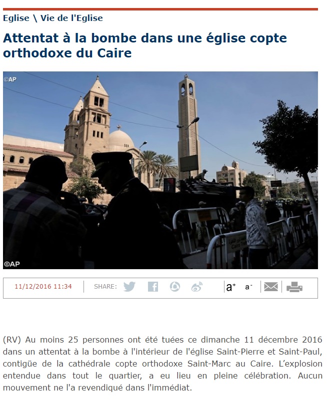 Sur twitter, le cardinal Leonardo Sandri, Préfet pour la Congrégation des Eglises orientales, écrit prier pour ses frères et sœurs de l’Eglise copte d’Egypte, après l’explosion dans la cathédrale Saint-Marc.