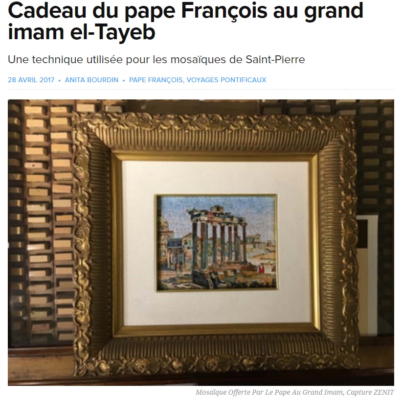 “Vue du Forum romain »: c’est le titre de la mosaïque offerte par le pape François au grand imam de Al-Azhar, Ahmed el-Tayeb, ce vendredi 28 avril 2017, à l’occasion de sa participation, au Caire (Egypte), à la conférence internationale interreligieuse organisée par Al-Azhar et le Conseil musulman des Anciens (Muslim Council of Elders) sur la paix globale.