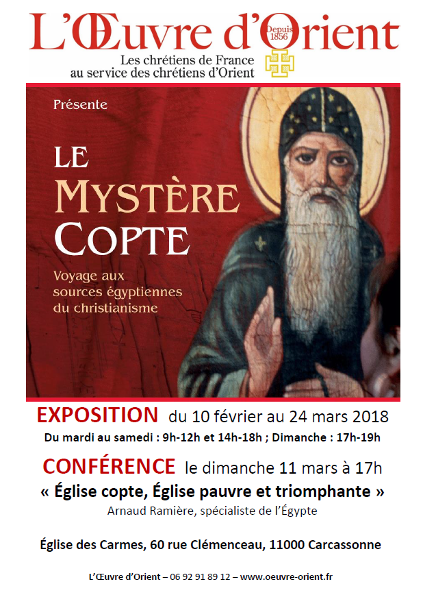 A l’occasion de cette exposition se tiendra la conférence d’Arnaud Ramière, spécialiste de l’Egypte, sur le thème « Église copte, Église pauvre et triomphante » le 11 mars à 17h à l’église des Carmes.