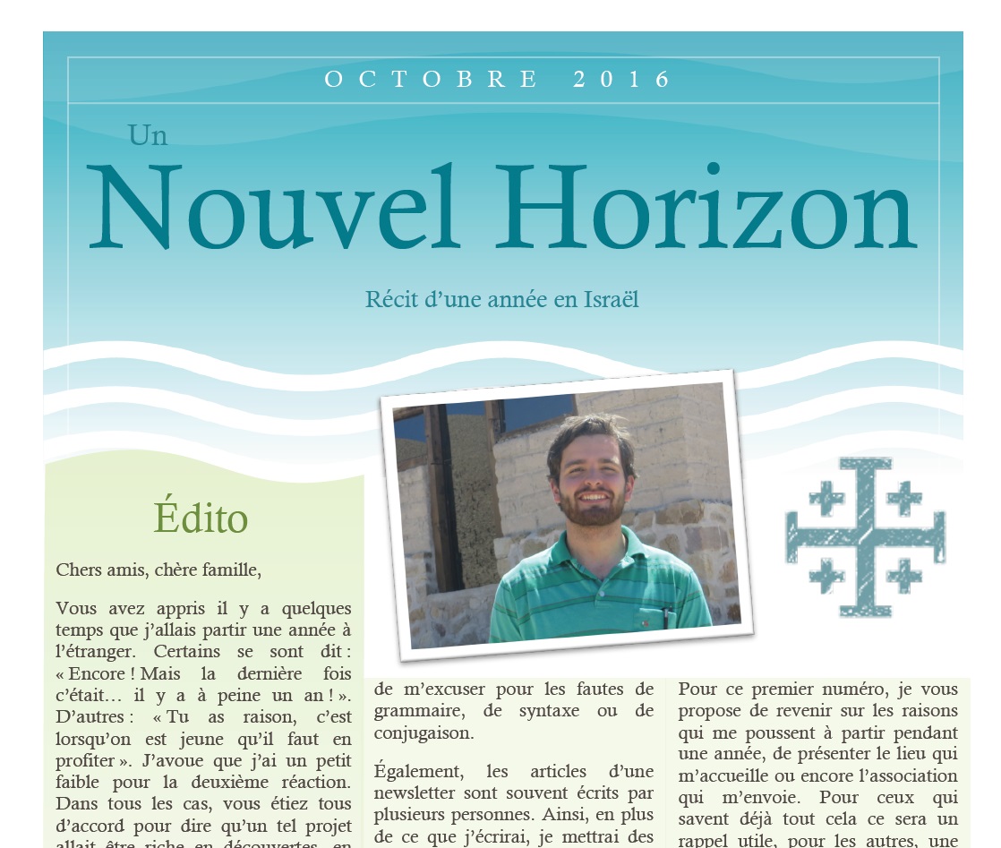 Lors de mon séjour en Argentine, vous étiez beaucoup à me suivre grâce à mon blog. Partant cette fois en Israël, j’ai décidé qu’un lien s’établirait par le biais d’un petit bulletin d’informations, une sorte de newsletter mensuelle. Vous recevrez donc chaque mois un