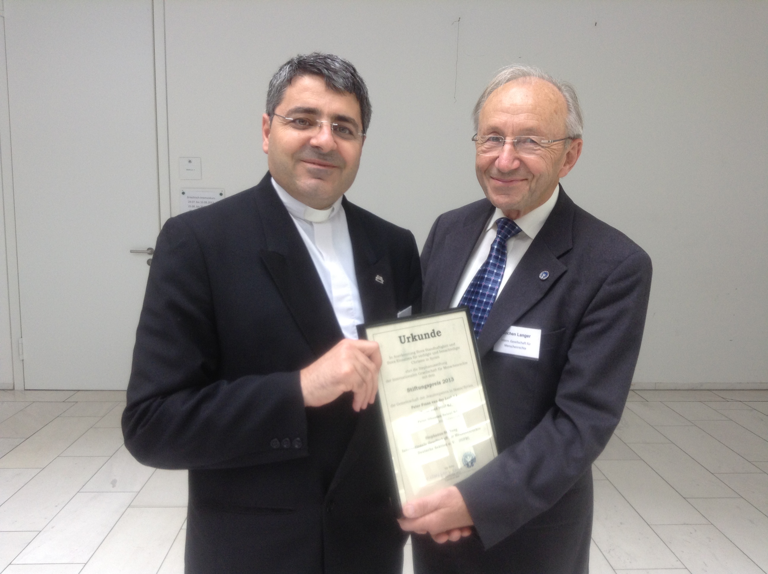 Quelle joie d’être parmi vous aujourd’hui pour recevoir ce prix remis par votre fondation Stephanus qui aide les œuvres humanitaires touchant tout homme. J’aurai aimé venir avec le père Frans, mon compagnon jésuite, mon supérieur et mon ami dans cette crise. Les 900 mètres qui nous séparent n’ont pas pu couper la communication entre nous et ne nous ont pas empêchés de nous soutenir l’un l’autre.