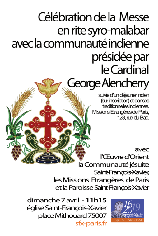 Messe à 11h15 présidée par le Cardinal George Alenchery, archevêque majeur de l’Eglise syro-malabare en Inde. Par ailleurs, seront présents les prêtres de la communauté indienne d'Ile de France.