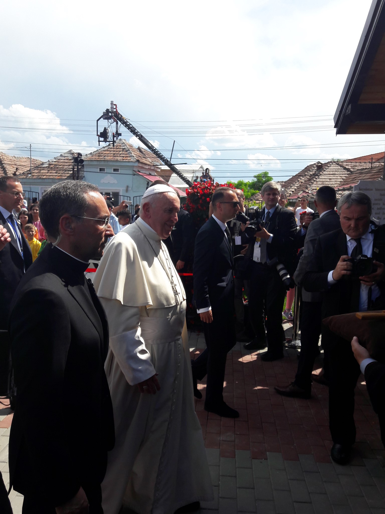 Le Pape François accompagné du Cardinal Parolin, du Cardinal Sandri et du Cardinal Gallagher est à la rencontre de la communaute rom de Blaj.