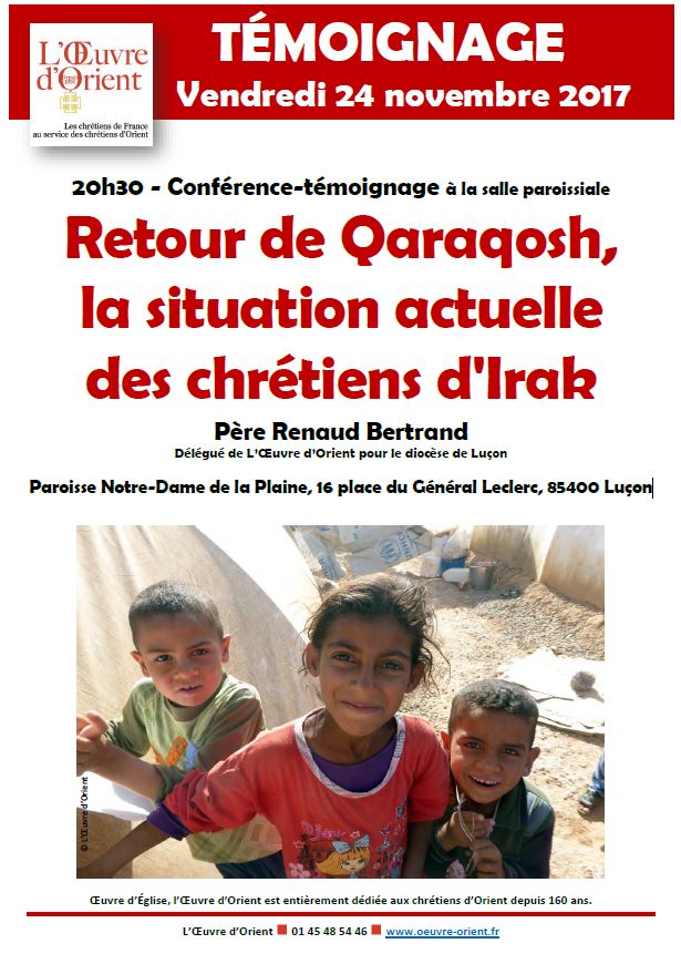 Luçon (85) : Témoignage "Retour de Qaraqosh, la situation actuelle des chrétiens d’Irak" le 24 novembre