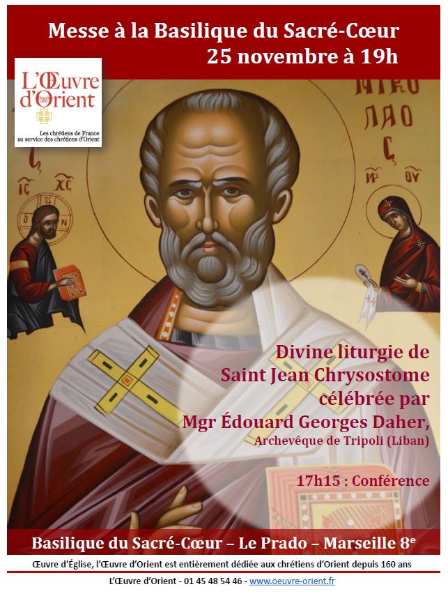 La divine Liturgie de Saint Jean Chrysostome sera célébrée à la Basilique du Sacré-Cœur de Marseille en présence de Mgr Georges PONTIER, archevêque de Marseille et de Mgr Gollnisch, le samedi 25 novembre à 19h.