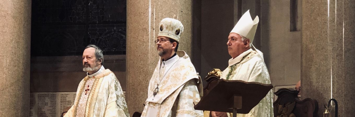 Permettez-moi de vous transmettre les salutations du Père et Chef de l’Église gréco-catholique ukrainienne, Sa Béatitude Sviatoslav, ainsi que de l’ensemble de notre épiscopat, de notre clergé et des fidèles gréco-catholique ukrainiens, y compris ceux qui assistent à cette liturgie. Soyez remerciés de nous offrir cette belle occasion de pouvoir aujourd’hui, célébrer la Divine Liturgie dans cette magnifique basilique du Sacré Cœur !