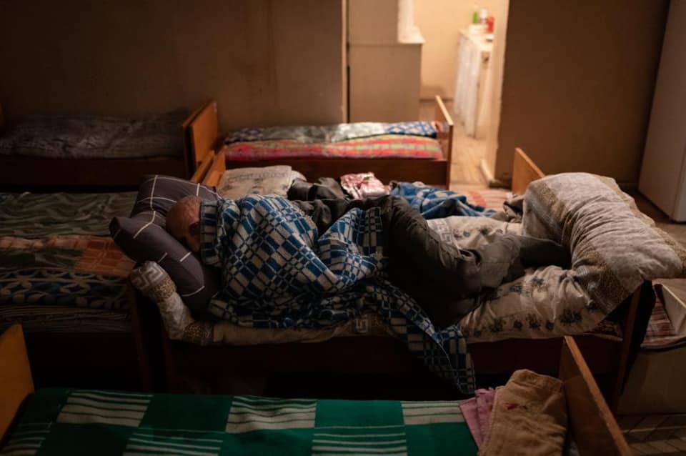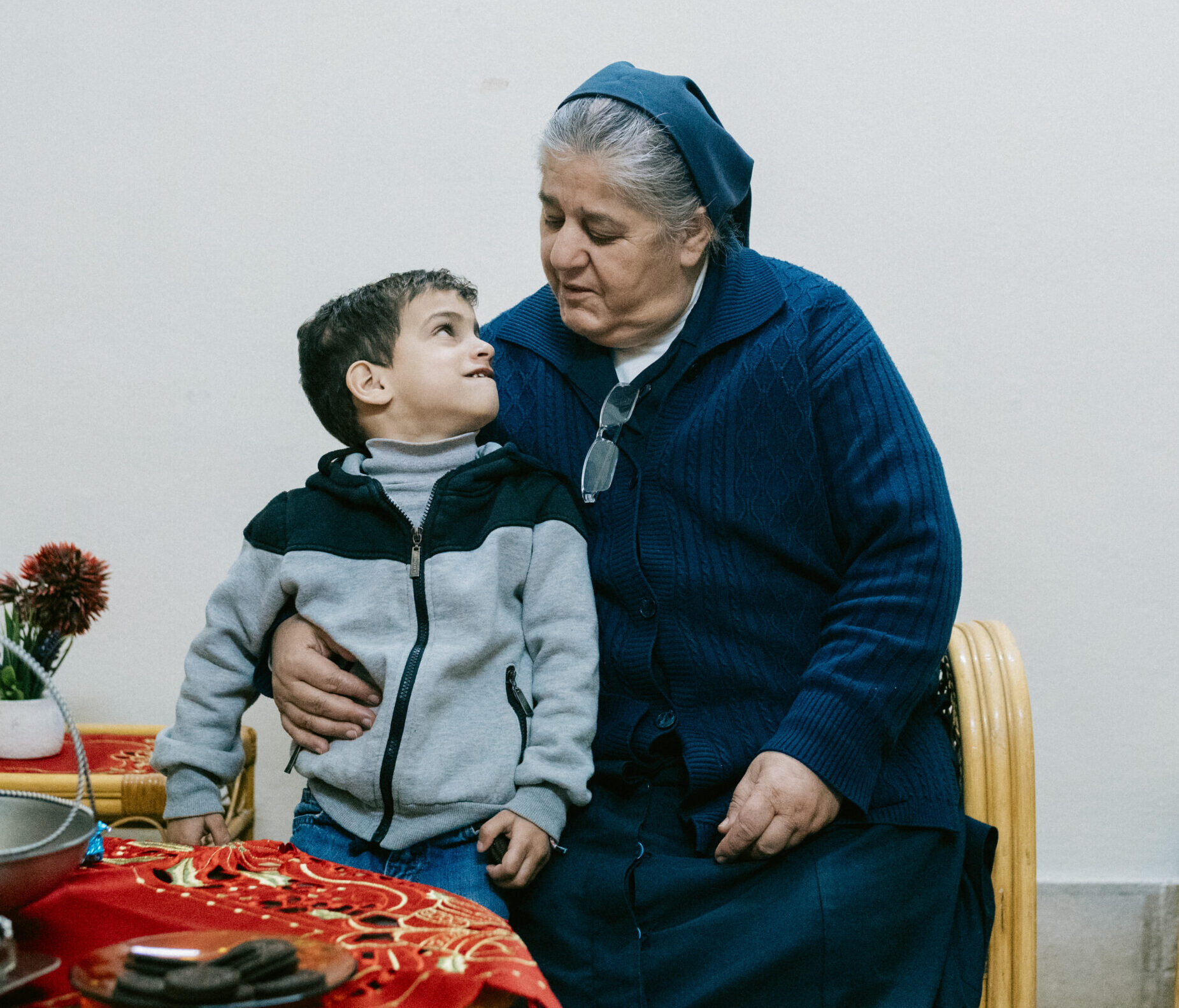 Scène de vie quotidienne au sein de la maison de retraite de Dohuk (souvent également qualifié de centre pour personnes handicapées), qui accueille exclusivement des femmes âgées, et qui est tenue par les Surs chaldéennes du Sacré cur de Jésus d’Erbil. Un évêque rend visite à une résidente alitée, en présence de surs.