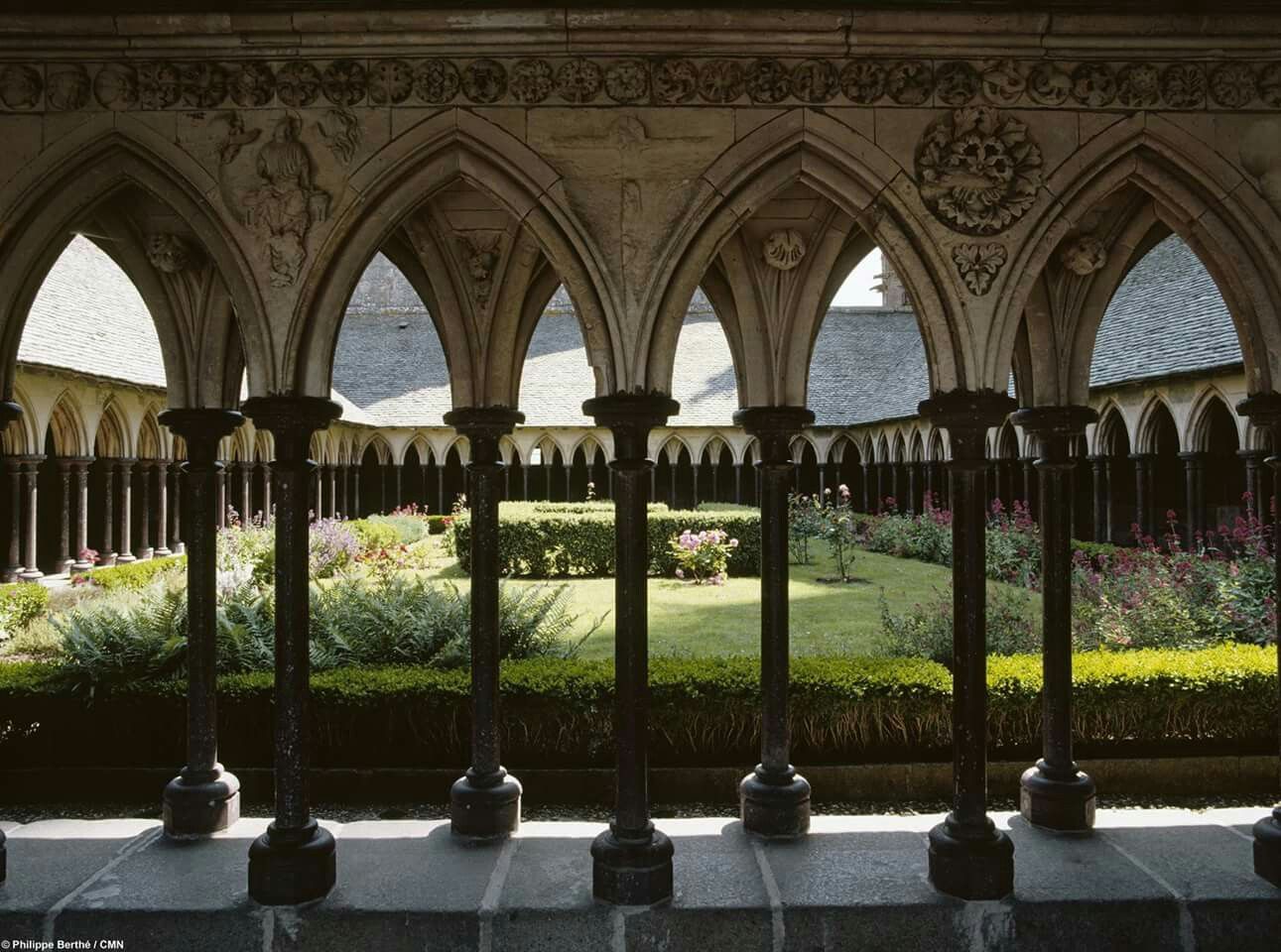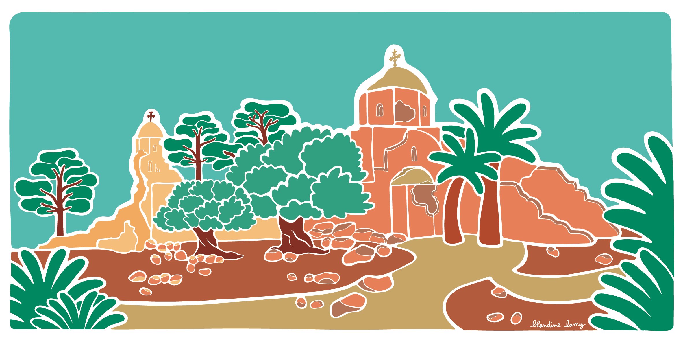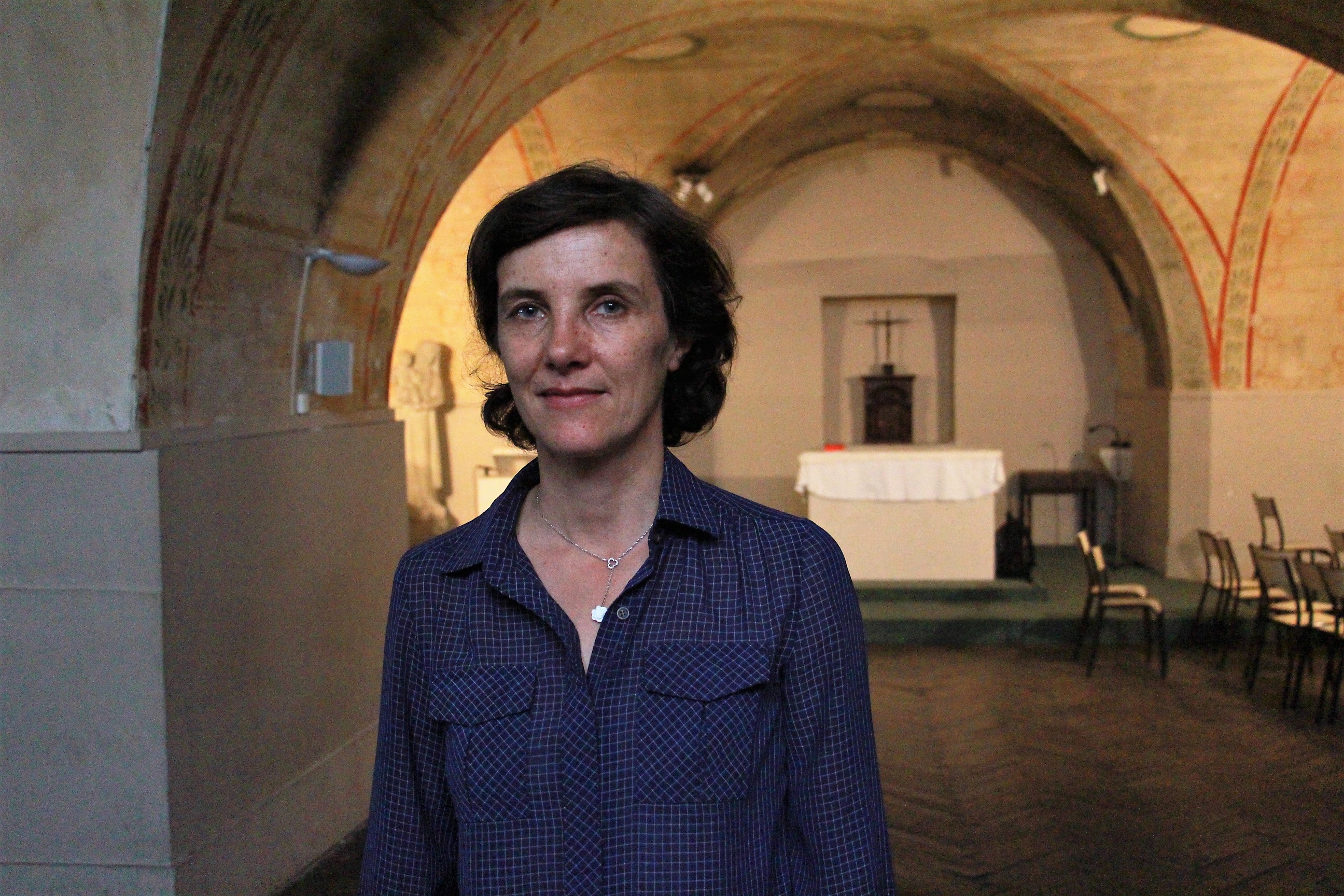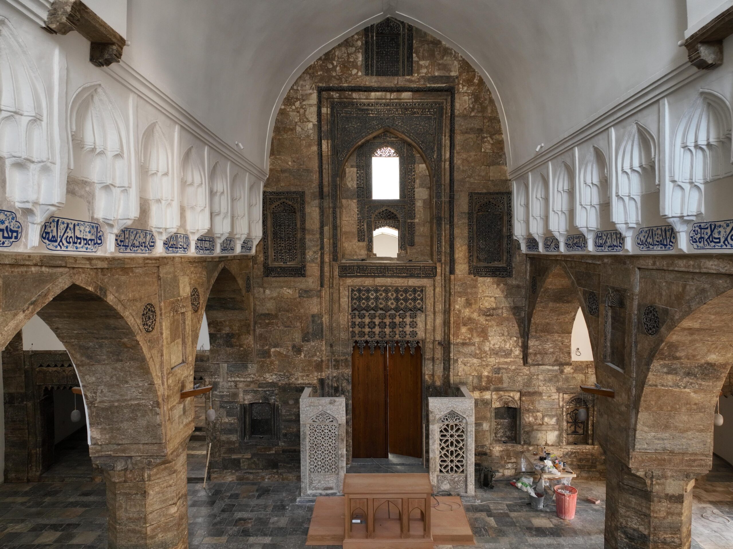 Intérieur de l’église à la fin du chantier de restauration. Vue sur les inscriptions découvertes pendant les travaux. Elles courent tout autour de la nef centrale.