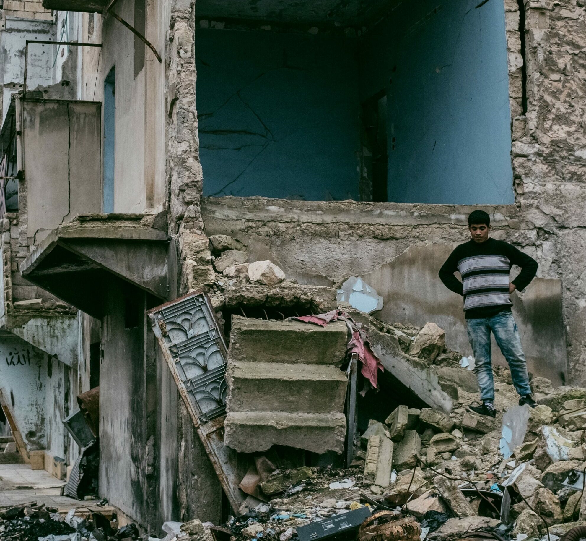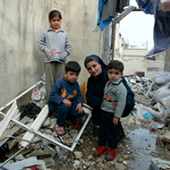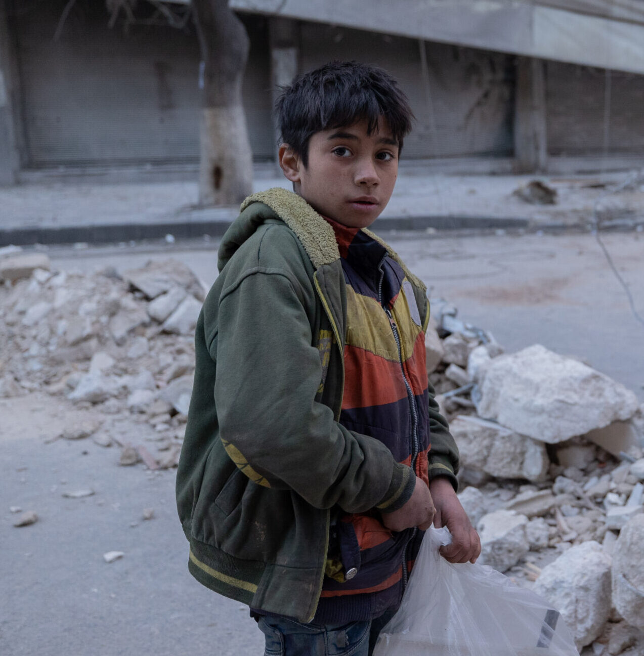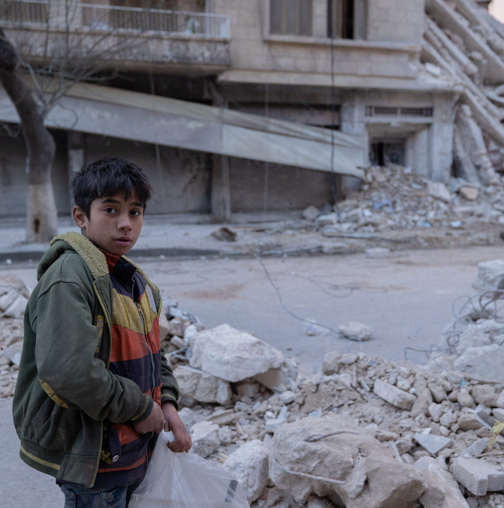 17 décembre 2018: Jeune garçon dans le quartier particulièrement éprouvé par les combats de Sakhour à Alep Est. Alep, Syrie.