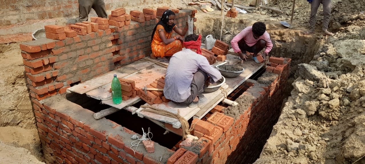 Chantier de construction, par la communauté Little flower (mission de Gorakhpur), d’une salle communautaire (salle polyvalente) pour les habitants du village d’Asnar (district de Siddharthnagar), dans l’Uttar Pradesh, en Inde.