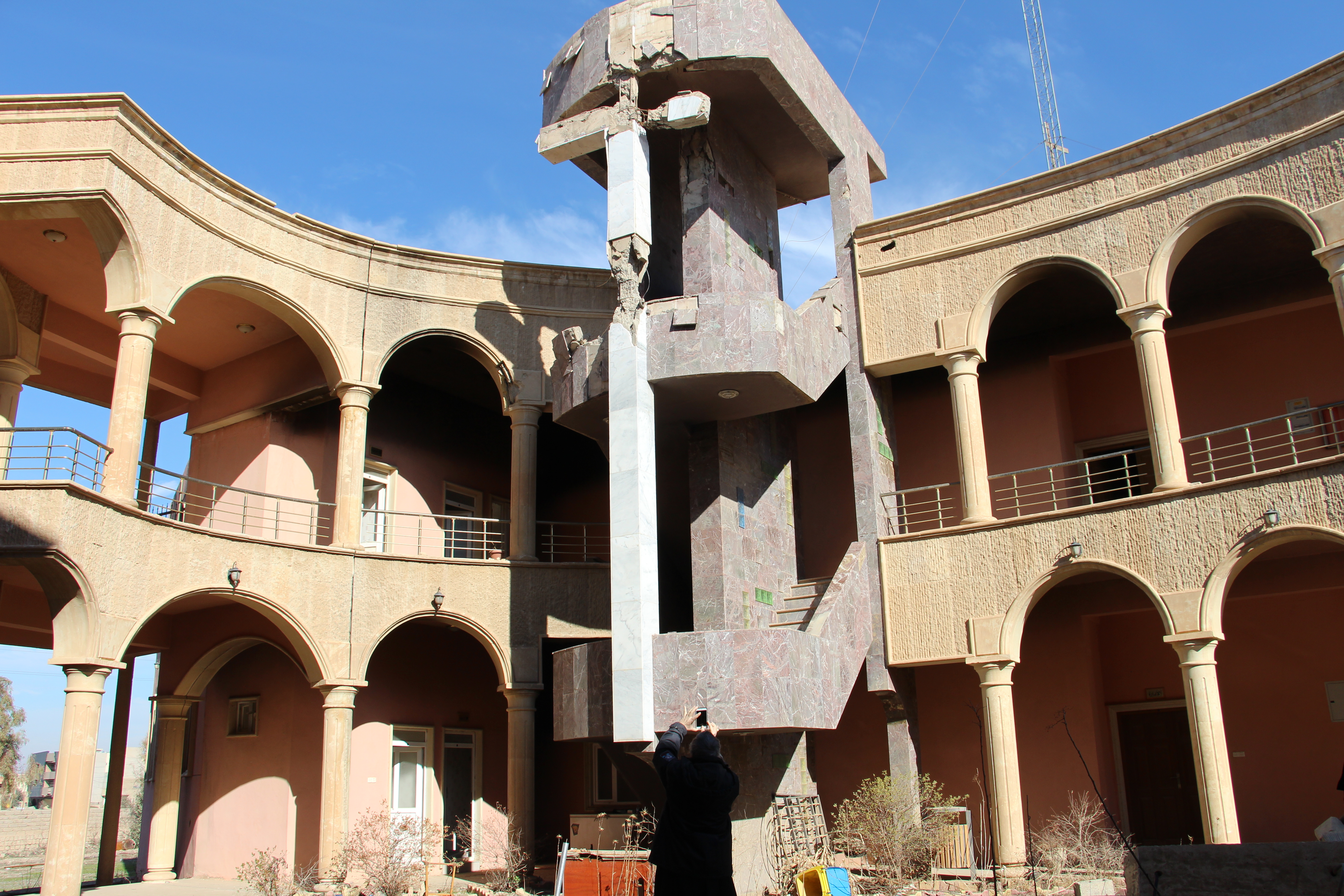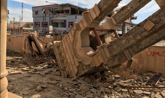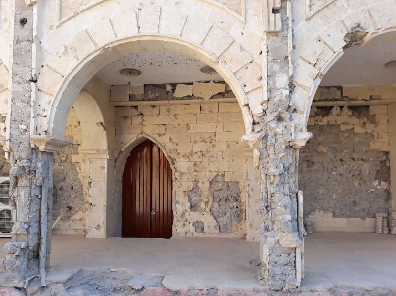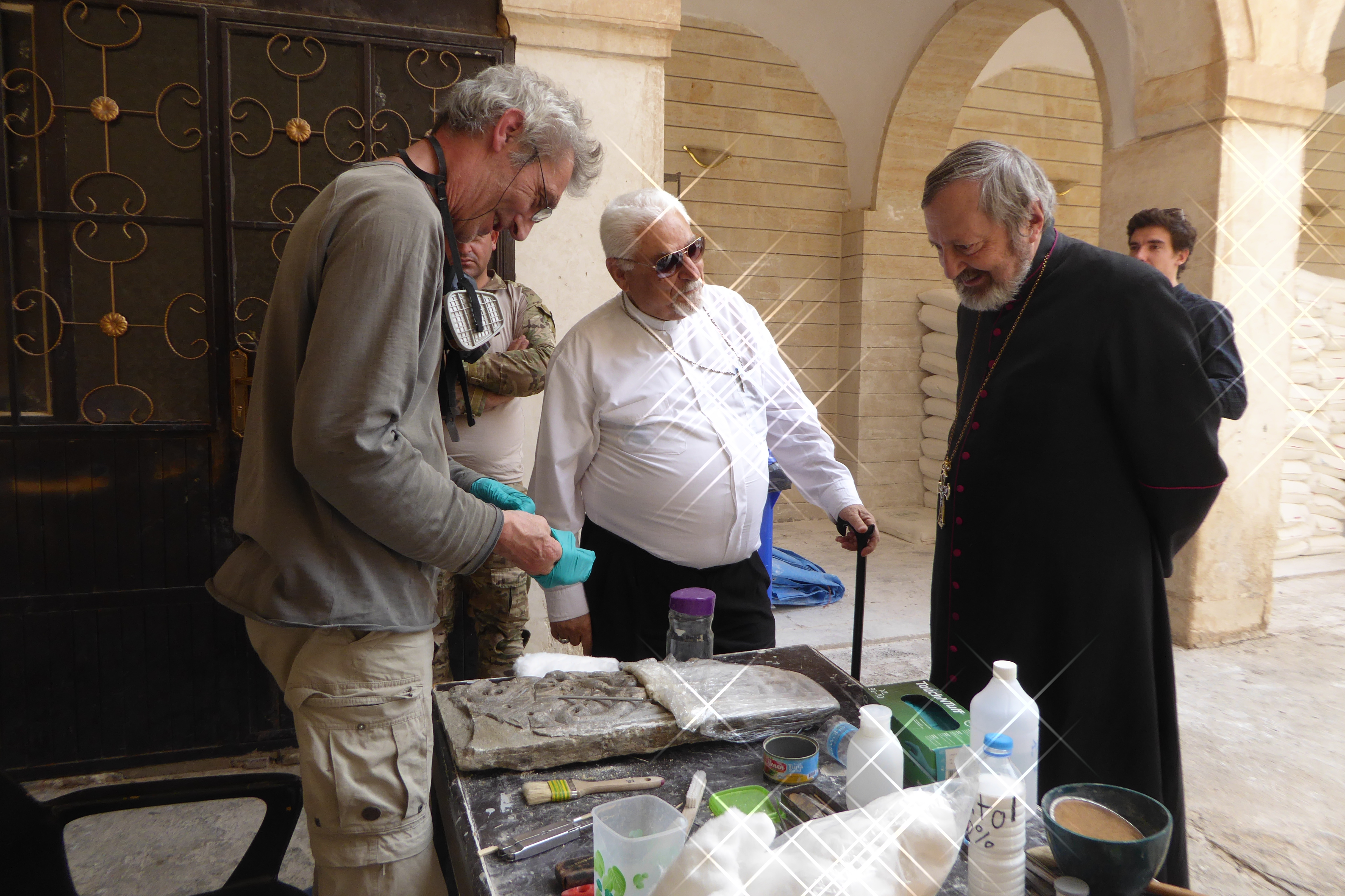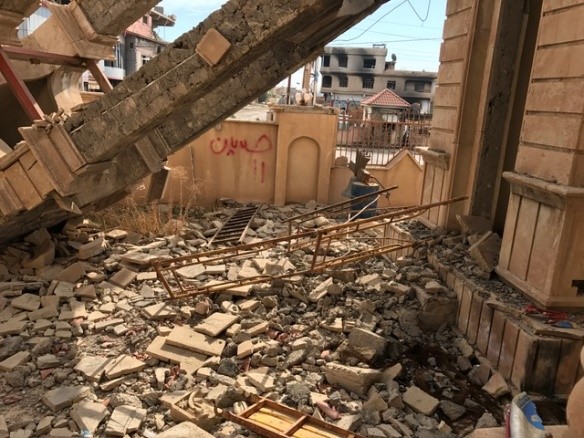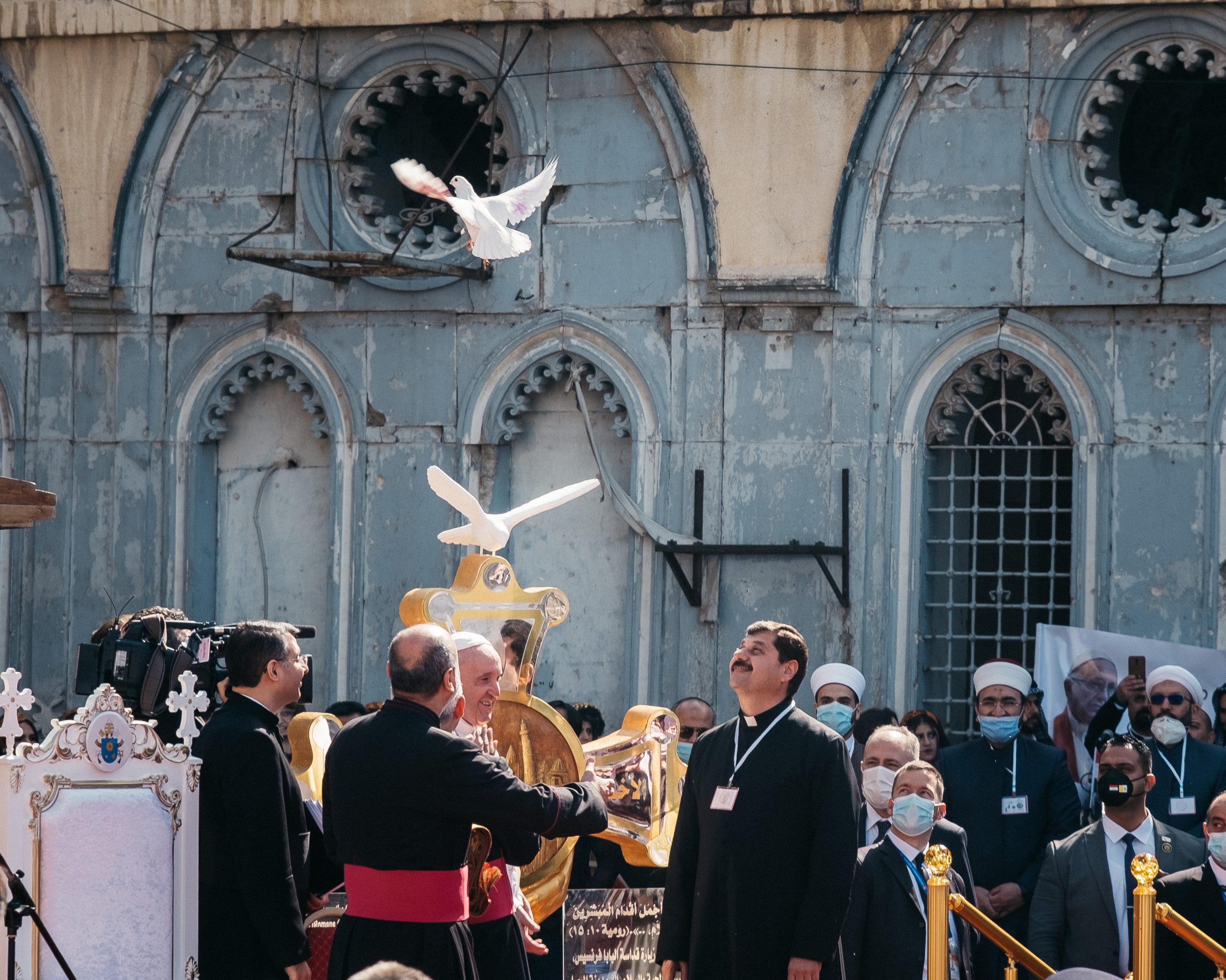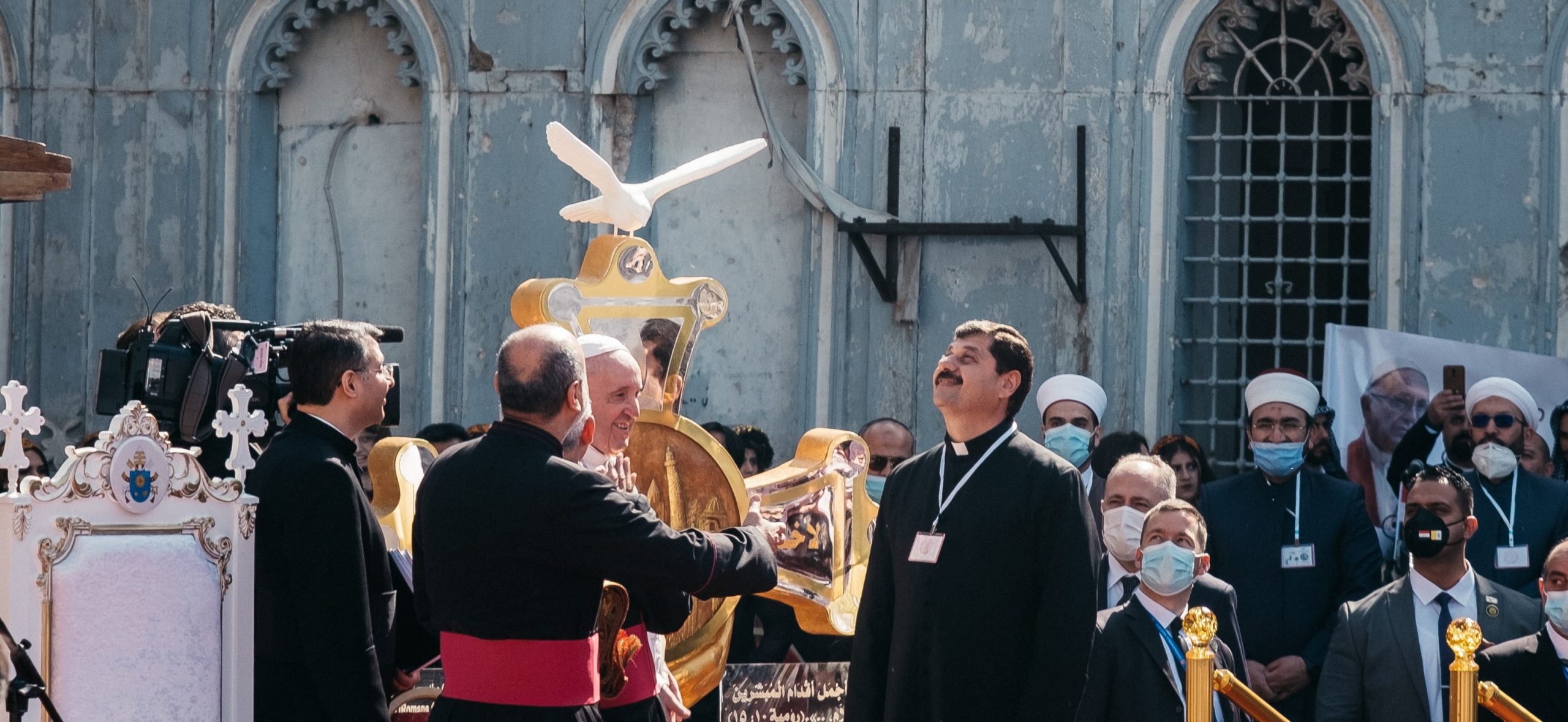 7 March 2021: Pope Francis places of the churches (all destroyed by Daesh) hosted by Archbishop Najeeb, Chaldean Archbishop of Mosul. The sovereign pontiff made a speech of peace and fraternity. Mosul. Iraq.