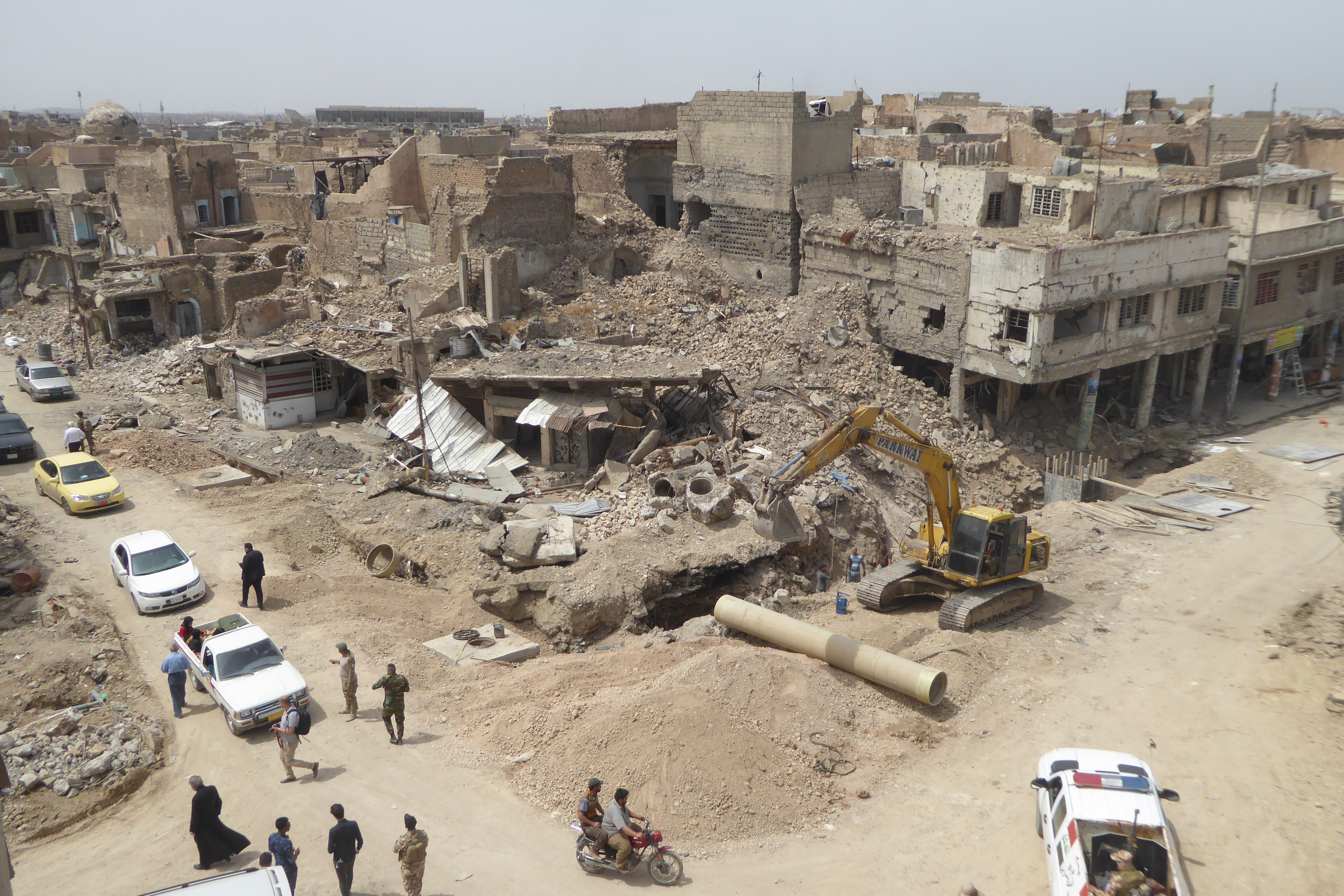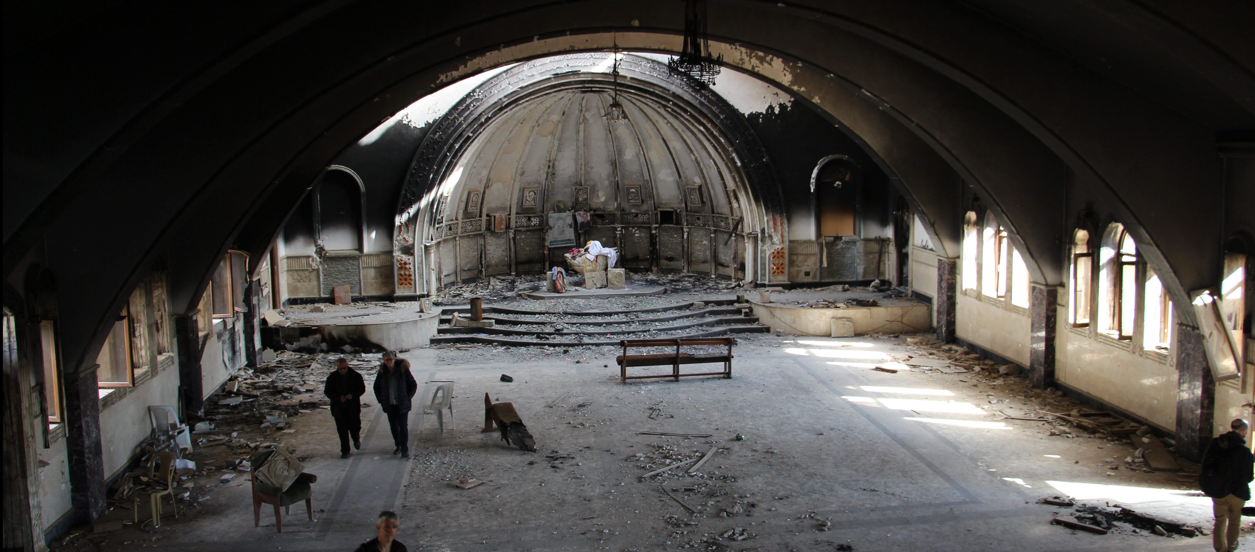 7 mars 2021: Le pape Francois place des eglises (toutes detruites par Daesh) accueilli par Mgr NAJEEB, archeveque chaldeen de Mossoul. Le souverain pontife y a tenu un discours de paix et de fraternite. Mossoul. Irak.