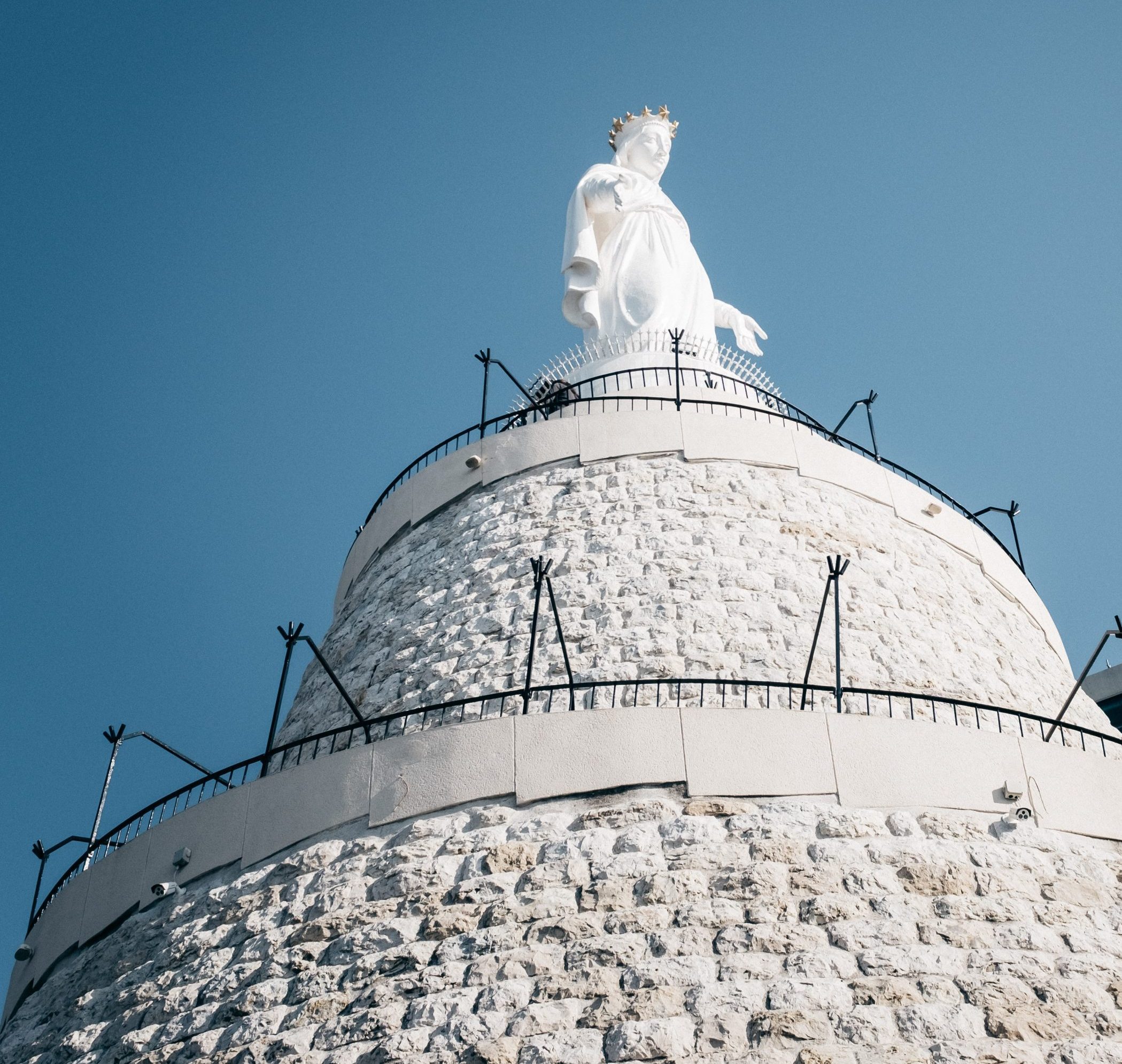 18 novembre 2019 : Sanctuaire Notre Dame du Mont Liban. La statue mesure 8,5 mètres de haut et 5 mètres de diamètres. Elle est posée sur une chapelle de 20 mètres de haut et domine Beyrouth, au sud et la baie de Jounieh. La vierge Marie bénéficie d’une aura toute particulière au Liban où chaque religieuon la vénère. Bien que ce sanctuaire ait été réalisé à l’inititative de l’église Maronite (catholique), tous les libanais viennent ici en pèlerinage. Jounieh (banlieue de Beyrouth), Liban