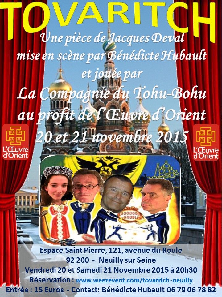 Le vendredi 20 et le samedi 21 novembre 2015 à 20h30, la pièce de théâtre Tovaritch, de Jacques Deval, mise en scène par Bénédicte Hubault sera jouée par la compagnie du Tohu-Bohu.