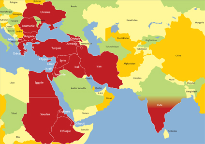 Éthiopie, Erythrée, Djibouti, Soudan, Égypte, Liban, Israël, Palestine, Jordanie, Syrie, Irak, Iran, Géorgie, Grèce, Bulgarie, Turquie, Ukraine, Roumanie, Arménie, Inde, Chypre, Macédoine