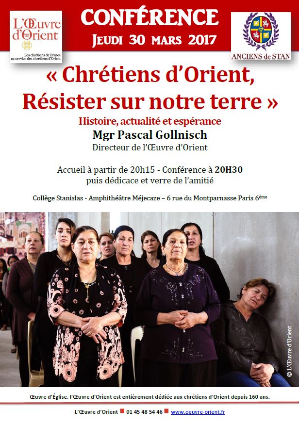 Mgr Pascal Gollnisch, président de l’Œuvre d’Orient, donnera une conférence autour du thème « Chrétiens d’Orient, résister sur notre terre », à l’amphithéâtre Méjecaze – 6 rue du Montparnasse, dans le 6ème arrondissement à Paris, jeudi 30 mars 2017 à 20h00. Cette conférence est proposée afin de traiter des enjeux actuels pour les Chrétiens d’Orient.