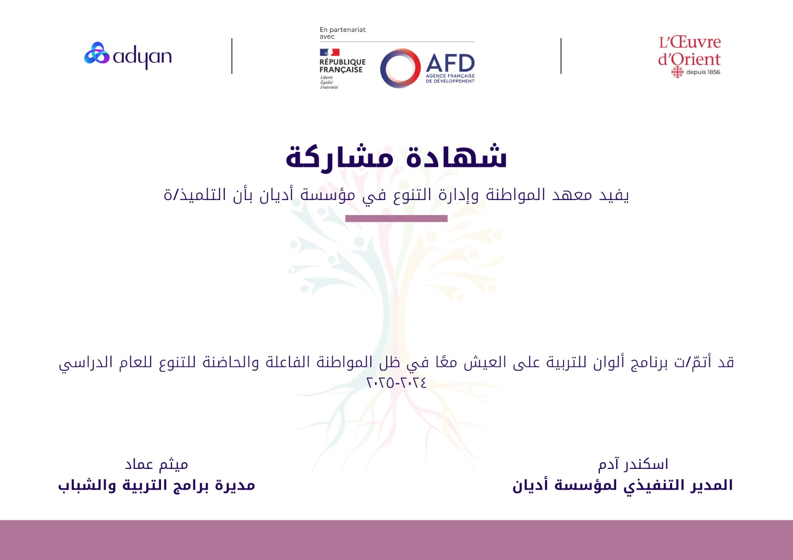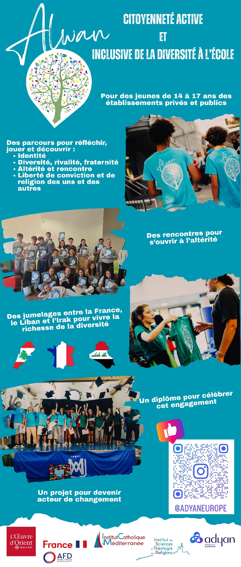 ALWAN qui signifie « couleurs » en langue arabe est un programme de coopération éducative internationale pour la citoyenneté active et inclusive de la diversité, visant à développer l’engagement civique, la sensibilisation interculturelle, la diversité culturelle et la coexistence pacifique chez les collégiens et lycéens au Liban, en Irak et en France.