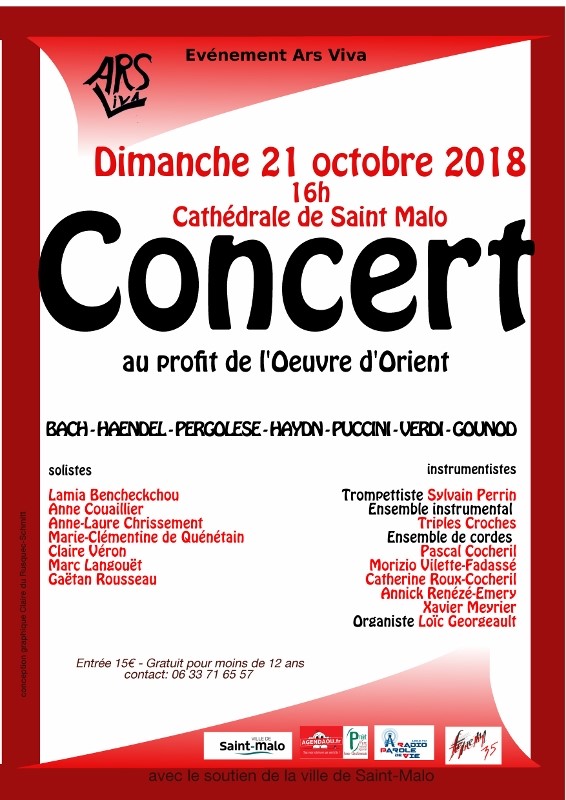 L’ensemble vocal Ars Viva donnera un concert de musique sacrée au profit de l’Œuvre d’Orient pour l’Hôpital Saint Louis d’Alep, tenu par les sœurs de Saint Joseph de l’apparition, le dimanche 21 octobre à 16h en la cathédrale de Saint-Malo.
