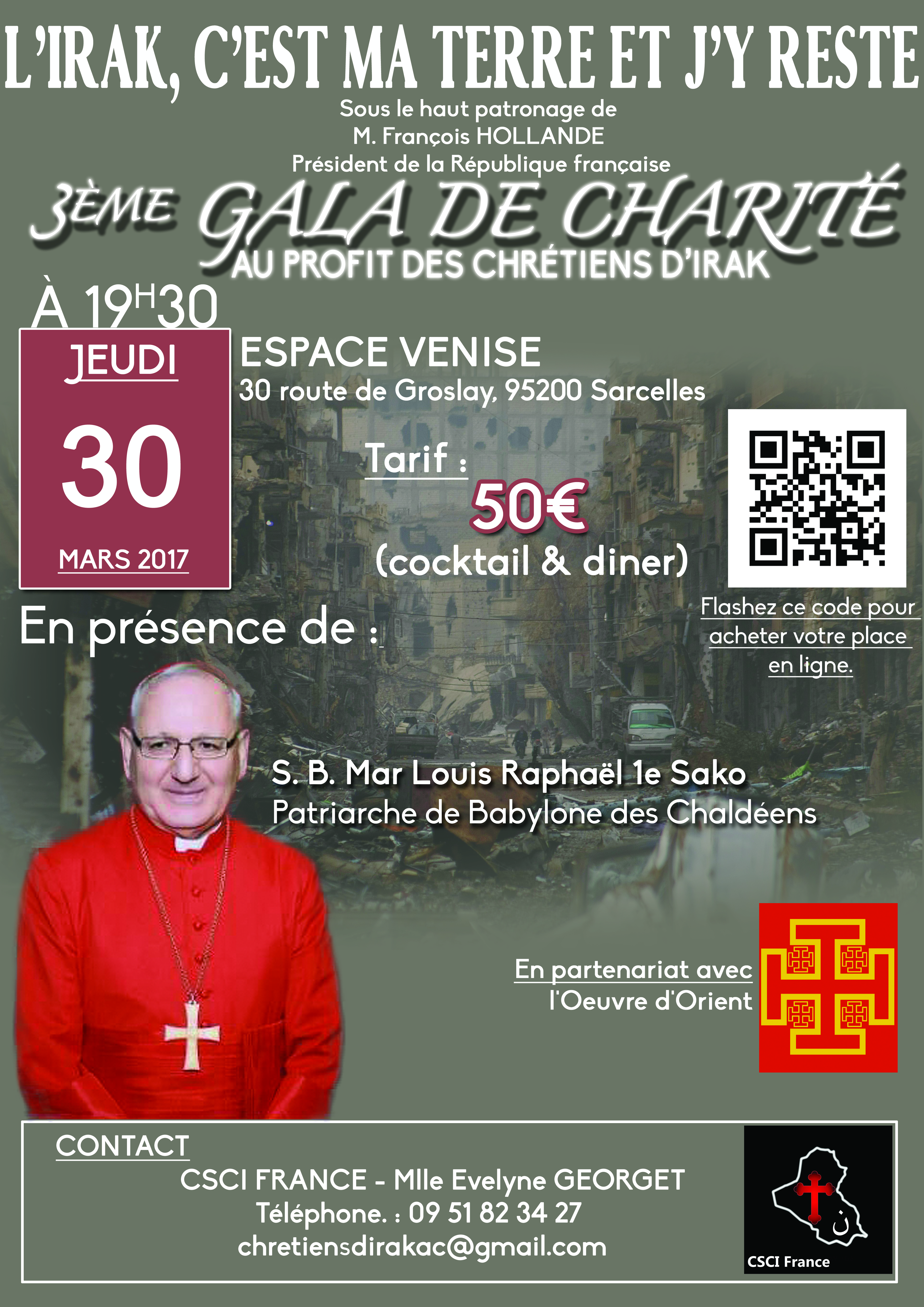 Cette soirée exceptionelle se déroulera en présence de Sa Béatidute Mar Louis Raphaël 1er Sako, Patriarche de Babylone des Chaldéens et sous le haut patronage de M. François Hollande, Président de la République française, en partenariat avec l’Œuvre d’Orient.