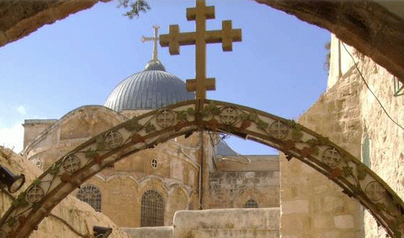 La coupole au-dessus du tombeau du Christ représente un soleil avec un puit de lumière en son milieu.
